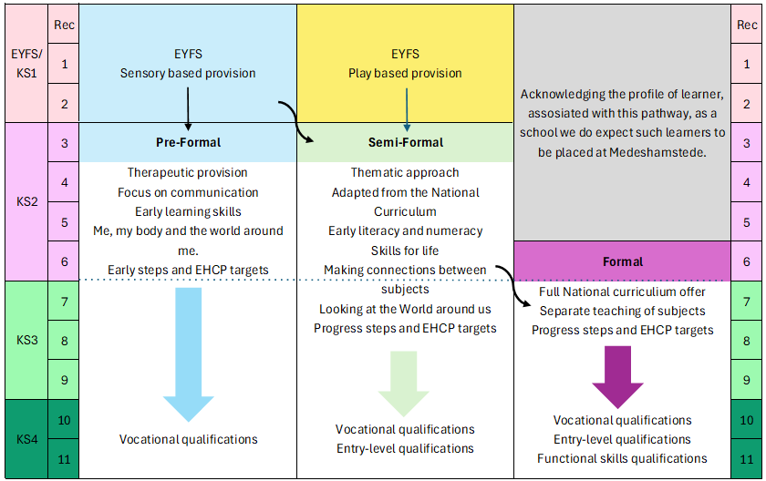 Formal Pathway: For students working below or towards age-related expectations. Students within this pathway access the full national curriculum offer where subjects are taught discretely. Key knowledge and skills are sequentially planned for but learning opportunities are adapted to acknowledge the cohorts' specific learning needs.